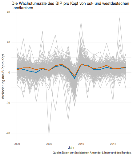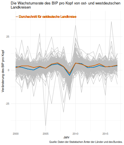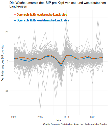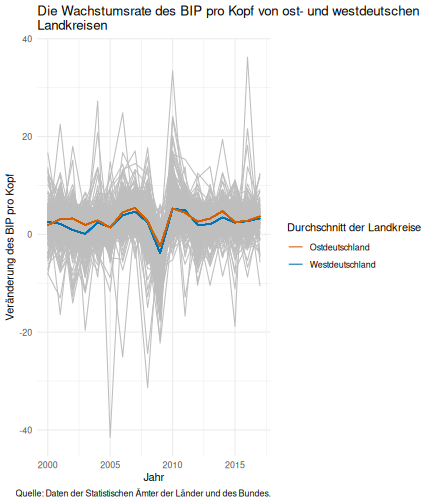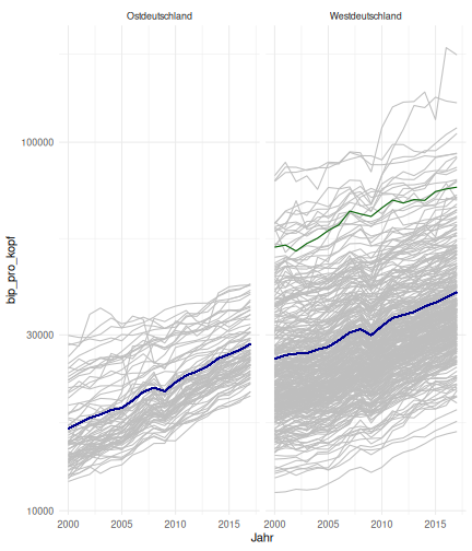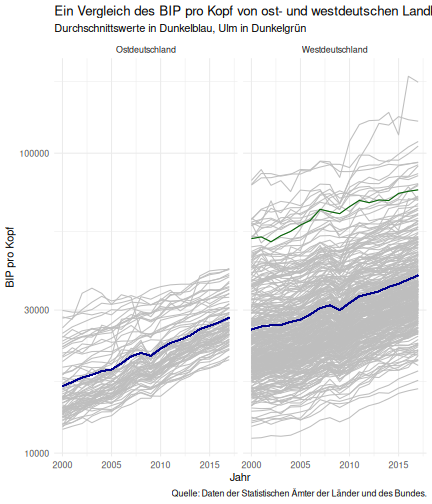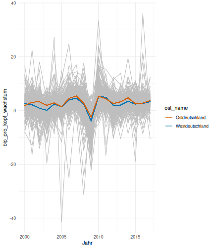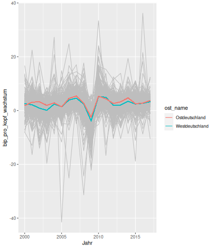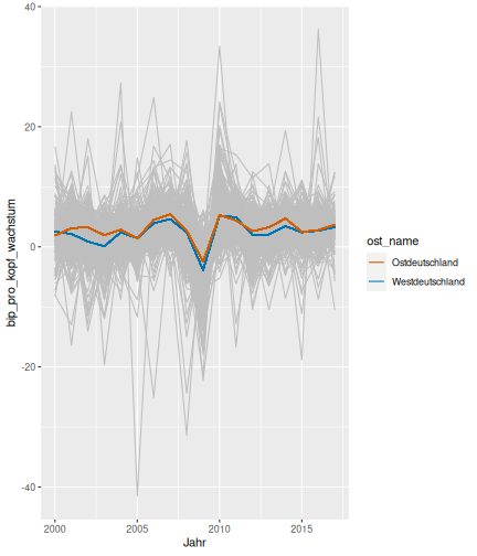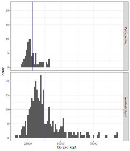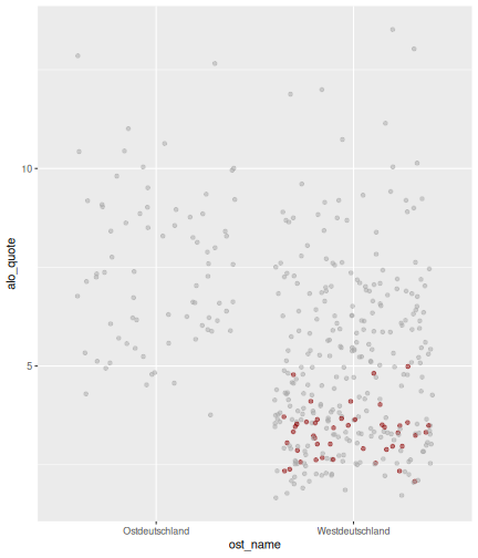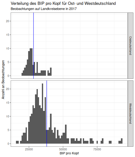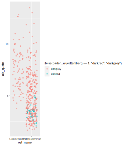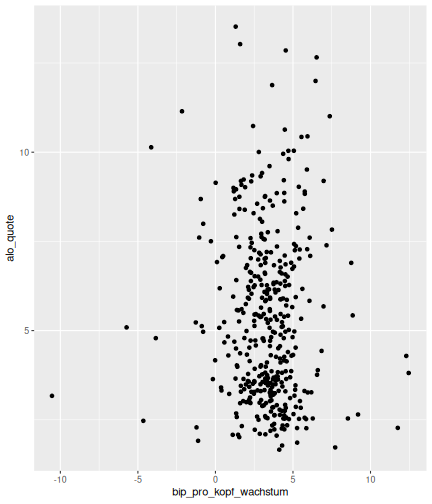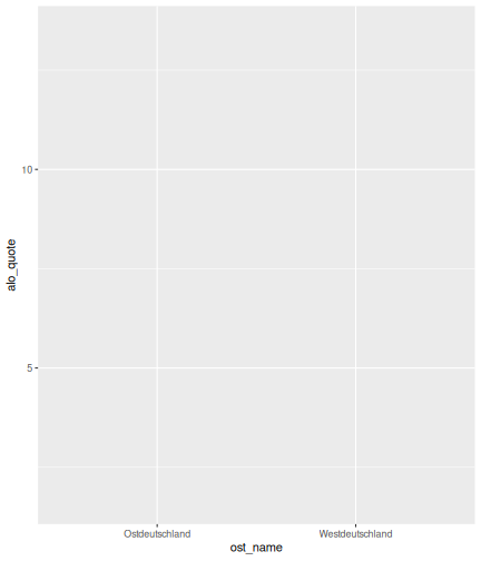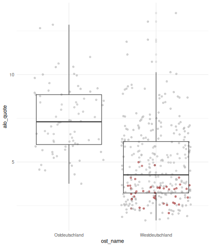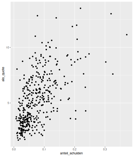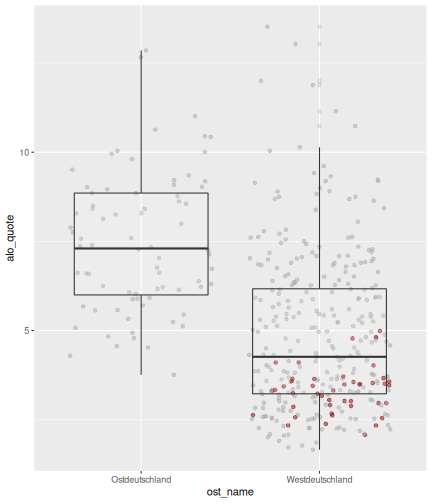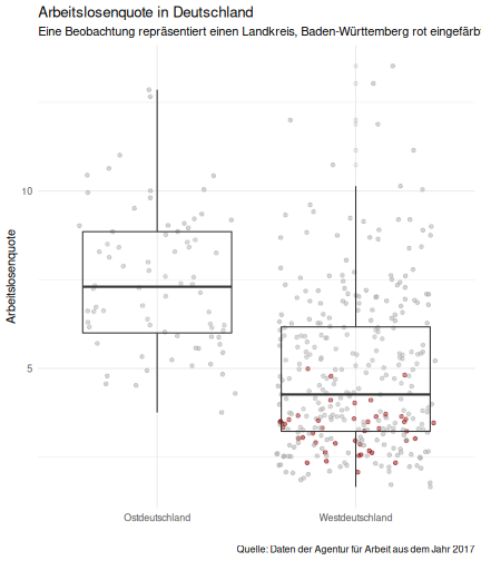 --- ## Arbeitslosenquote Mittelwert: 5,33 Prozent - Sehr hoch - Jedoch SGB II und SGB III - Konsistenzcheck auf [Statista](https://de.statista.com/statistik/daten/studie/1224/umfrage/arbeitslosenquote-in-deutschland-seit-1995/) zeigt eine Arbeitslosenquote von 5,8% für 2017 - **Jedoch:** Wir haben nicht Berlin und Hamburg in den Daten Standardabweichung: 2,36 - Sehr hohe Streuung - Deutliche regionale Unterschiede - Ist in Prozentpunkten Median: 4,99 Prozent - Nahe am Mittelwert - Deutet darauf hin das es wenige Landkreise mit sehr extremen Ausreißern gibt --- ## Verschuldung pro Kopf Mittelwert: 2743€ - Moderat von der Höhe her Standardabweichung: 2148€ - Sehr hohe Streuung - Deutliche regionale Unterschiede Median: 2081€ - Weiter weg vom Mittelwert - Deutet darauf hin das es einzelne Landkreise mit sehr extremen Ausreißern gibt --- ## BIP pro Kopf Mittelwert: 37086€ - Insgesamt recht hoch - Starker Wirtschaftsstandort Deutschland Standardabweichung: 16127€ - Sehr hohe Streuung - Deutliche regionale Unterschiede - Könnte von einzelnen Landkreisen getrieben werden Median: 33105€ - Weiter weg vom Mittelwert - Deutet darauf hin das es einzelne Landkreise mit sehr extremen Ausreißern gibt --- class: inverse, center, middle # Die Arbeitslosenquote auf Bundeslandebene --- ## Die Arbeitslosenquote auf Bundeslandebene .instructions[Es gibt deutliche unterschiede in der Arbeitslosenquote über die Bundesländer hinweg!] Wir betrachten: - Querschnittsdaten aus 2017 - Alle Landkreise - Für einige Landkreise haben wir keine Informationen (sogenannte "Missing values" -> `n_missing`) .question[Was wollen wir?] Die regionale Verteilung der Arbeitslosenquote in Deutschland im Jahr 2017 näher betrachten. --- ## Die Arbeitslosenquote auf Bundeslandebene Zuerst aggregieren wir die Daten auf Bundeslandebene: ```r bula_data <- gesamtdaten %>% group_by( bundesland_name ) %>% summarise(mean_alo = mean(alo_quote), sd_alo = sd(alo_quote), median_alo = median(alo_quote)) %>% ungroup() ``` --- ## Die Arbeitslosenquote auf Bundeslandebene count: false .panel1-bula_data-auto[ ```r *gesamtdaten ``` ] .panel2-bula_data-auto[ ``` ## # A tibble: 401 x 12 ## Regionalschlues… total_alo landkreis_name bundesland bundesland_name ## <chr> <dbl> <chr> <chr> <chr> ## 1 01001 4512 Flensburg 01 Schleswig-Hols… ## 2 01002 12345 Kiel 01 Schleswig-Hols… ## 3 01003 9692 Lübeck 01 Schleswig-Hols… ## 4 01004 3836 Neumünster 01 Schleswig-Hols… ## 5 01051 4632 Dithmarschen 01 Schleswig-Hols… ## 6 01053 5592 Herzogtum Lau… 01 Schleswig-Hols… ## 7 01054 5657 Nordfriesland 01 Schleswig-Hols… ## 8 01055 5748 Ostholstein 01 Schleswig-Hols… ## 9 01056 8599 Pinneberg 01 Schleswig-Hols… ## 10 01057 3264 Plön 01 Schleswig-Hols… ## # … with 391 more rows, and 7 more variables: Schulden_pro_kopf_lk <dbl>, ## # Einwohner <dbl>, Schulden_gesamt <dbl>, bip <dbl>, bip_pro_kopf <dbl>, ## # erw <dbl>, alo_quote <dbl> ``` ] --- count: false .panel1-bula_data-auto[ ```r gesamtdaten %>% * group_by( bundesland_name ) ``` ] .panel2-bula_data-auto[ ``` ## # A tibble: 401 x 12 ## # Groups: bundesland_name [16] ## Regionalschlues… total_alo landkreis_name bundesland bundesland_name ## <chr> <dbl> <chr> <chr> <chr> ## 1 01001 4512 Flensburg 01 Schleswig-Hols… ## 2 01002 12345 Kiel 01 Schleswig-Hols… ## 3 01003 9692 Lübeck 01 Schleswig-Hols… ## 4 01004 3836 Neumünster 01 Schleswig-Hols… ## 5 01051 4632 Dithmarschen 01 Schleswig-Hols… ## 6 01053 5592 Herzogtum Lau… 01 Schleswig-Hols… ## 7 01054 5657 Nordfriesland 01 Schleswig-Hols… ## 8 01055 5748 Ostholstein 01 Schleswig-Hols… ## 9 01056 8599 Pinneberg 01 Schleswig-Hols… ## 10 01057 3264 Plön 01 Schleswig-Hols… ## # … with 391 more rows, and 7 more variables: Schulden_pro_kopf_lk <dbl>, ## # Einwohner <dbl>, Schulden_gesamt <dbl>, bip <dbl>, bip_pro_kopf <dbl>, ## # erw <dbl>, alo_quote <dbl> ``` ] --- count: false .panel1-bula_data-auto[ ```r gesamtdaten %>% group_by( bundesland_name ) %>% * summarise(mean_alo = mean(alo_quote), * sd_alo = sd(alo_quote), * median_alo = median(alo_quote)) ``` ] .panel2-bula_data-auto[ ``` ## # A tibble: 16 x 4 ## bundesland_name mean_alo sd_alo median_alo ## <chr> <dbl> <dbl> <dbl> ## 1 Baden-Württemberg 3.31 0.642 3.33 ## 2 Bayern 3.04 0.775 2.98 ## 3 Berlin NA NA NA ## 4 Brandenburg 7.98 1.93 8.27 ## 5 Bremen 8.61 2.02 8.61 ## 6 Hamburg NA NA NA ## 7 Hessen 5.02 1.34 5.11 ## 8 Mecklenburg-Vorpommern 8.41 1.56 7.95 ## 9 Niedersachsen 6.14 1.76 6.03 ## 10 Nordrhein-Westfalen 7.14 2.42 6.84 ## 11 Rheinland-Pfalz 5.29 1.47 5.20 ## 12 Saarland 5.88 1.75 5.34 ## 13 Sachsen 6.59 1.05 6.25 ## 14 Sachsen-Anhalt 9.00 1.56 8.87 ## 15 Schleswig-Holstein 6.34 0.989 6.86 ## 16 Thüringen 6.26 1.79 5.68 ``` ] --- count: false .panel1-bula_data-auto[ ```r gesamtdaten %>% group_by( bundesland_name ) %>% summarise(mean_alo = mean(alo_quote), sd_alo = sd(alo_quote), median_alo = median(alo_quote)) %>% * ungroup() -> bula_data ``` ] .panel2-bula_data-auto[ ] <style> .panel1-bula_data-auto { color: black; width: 38.6060606060606%; hight: 32%; float: left; padding-left: 1%; font-size: 80% } .panel2-bula_data-auto { color: black; width: 59.3939393939394%; hight: 32%; float: left; padding-left: 1%; font-size: 80% } .panel3-bula_data-auto { color: black; width: NA%; hight: 33%; float: left; padding-left: 1%; font-size: 80% } </style> --- ## Die Arbeitslosenquote auf Bundeslandebene Anschließend wollen wir uns eine ansprechende und informative deskriptive Tabelle erstellen: .pull-left[ ``` ## # A tibble: 14 x 4 ## bundesland_name mean_alo sd_alo median_alo ## <chr> <dbl> <dbl> <dbl> ## 1 Bayern 3.04 0.775 2.98 ## 2 Baden-Württemberg 3.31 0.642 3.33 ## 3 Hessen 5.02 1.34 5.11 ## 4 Rheinland-Pfalz 5.29 1.47 5.20 ## 5 Saarland 5.88 1.75 5.34 ## 6 Niedersachsen 6.14 1.76 6.03 ## 7 Thüringen 6.26 1.79 5.68 ## 8 Schleswig-Holstein 6.34 0.989 6.86 ## 9 Sachsen 6.59 1.05 6.25 ## 10 Nordrhein-Westfalen 7.14 2.42 6.84 ## 11 Branden