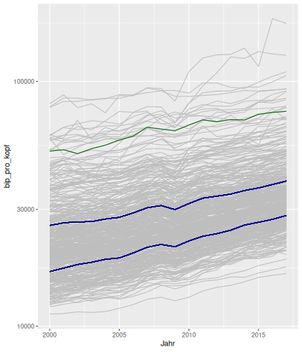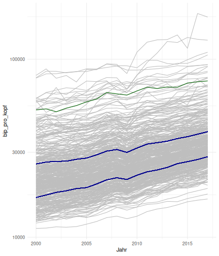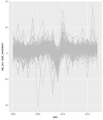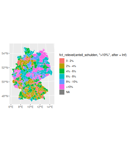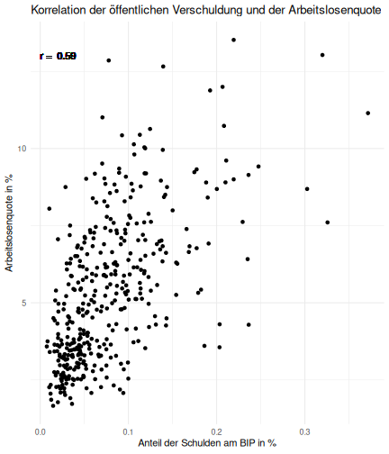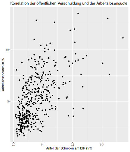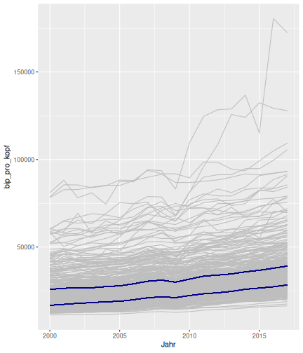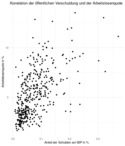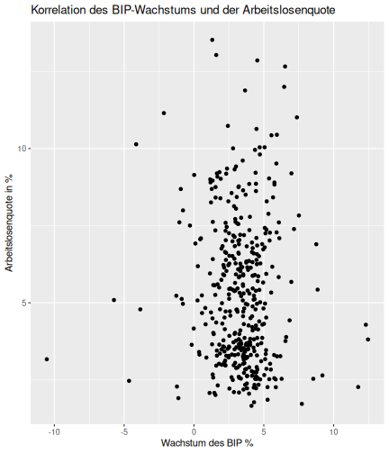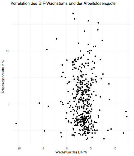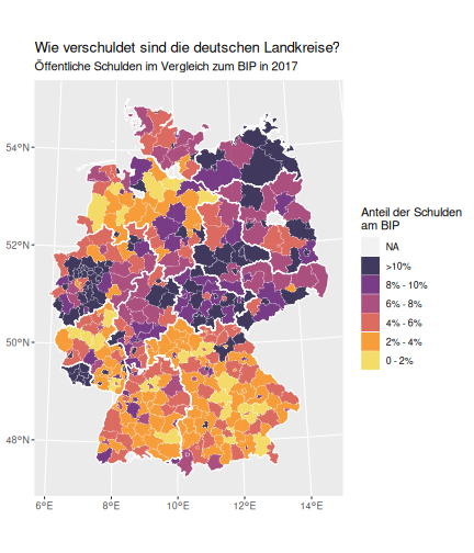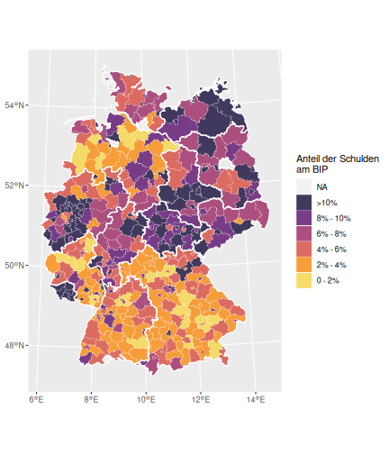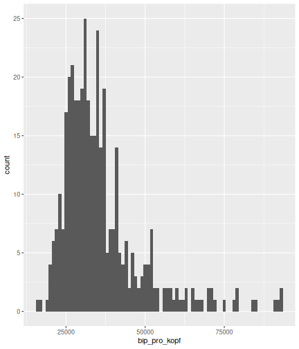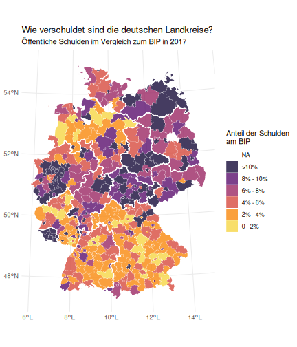 class: center, middle, inverse, title-slide # Case-Study zur Arbeitslosigkeit in Deutschland --- <style type="text/css"> .remark-code{line-height: 1.5; font-size: 80%} @media print { .has-continuation { display: block; } } </style> ## Organisatorische Hinweise - Viele Deadlines - Ungewohntes Format (sehr technisch) - Github, RStudio, R - Arbeitsschritte mit Github (3. Problem Set von Github herunterladen und lösen) .alert[Dies ist alles neu und das ist uns bewusst!] -- Was bieten wir ihnen: - Tutorium mit Lara morgen um 14:15 Uhr in BBB - Hilfe im Forum - Video Tutorials - klonen von Github (mit Github-Desktop) - RTutor Problem Set lokal ausführen (gleich wie auf der RStudio Cloud) --- ## Recap letzte Vorlesungseinheit - Verschiedene Arten einen Datensatz einzulesen - `readr`, `readxl`, `haven`... - Variablenbezeichnungen stehen nicht zwangsläufig in erster Spalte - Es gibt oft und viele `NA`s in echten Daten - Konsistenzchecks wichtig - Datensätze sind nicht immer in der Form das wir diese direkt Einlesen können - Aus verschiedenen Quellen einlesen, z.B. über eine `for`-Schleife - Umformen, da die Daten im `wide`-Format vorliegen -> `pivot_longer` - Es ist wichtig sich selbst ein Bild von den Daten zu machen --- class: inverse, center, middle # Analyse der Daten --- ## Deskriptive vs. induktive Statistik - Deskriptive Statistik (beschreibende Statistik) ist beschreibend (wer hätte es gedacht) - Induktive (auch schließende) Statistik versucht aus der Stichprobe auf die Grundgesamtheit zu schließen -- - Keine Unterscheidung in der Formel - Keine Unterscheidung in dem Datensatz der verwendet wird -- .question[Worin genau besteht der Unterschied zwischen der deskriptiven und der induktiven Statistik?] --- ## Deskriptive Statistik - Beschreibung des Datensatzes - **Beispiel:** Daten von der Agentur für Arbeit über die Arbeitslosenquote in den Landkreisen - Mehrere Arten denkbar - Tabellenform - Visualisierung mittels Schaubildern .instructions[Sie wollen etwas über ihren aktuellen Datensatz lernen] --- ## Induktive Statistik - Interesse gilt nicht dem Datensatz selbst, sondern der Population - Sie haben keine Vollerhebung durchgeführt, sondern nur eine (zufällige) Stichprobe der Population gezogen - **Beispiel:** Mikrozensus, d.h. eine Befragung von zufällig ausgewählten Haushalten in Deutschland - Sie wollen aus der Stichprobe schätzen, wie sich die beobachtete Größe in der Population verhält - Es gibt viele Arten der induktiven Statistik. Die zwei häufigsten: - Vorhersage - Erkennen kausaler Zusammenhänge -- .alert[In die induktive Statistik tauchen wir nächstes Semester tiefer ein.] --- class: inverse, center, middle # Deskriptive Statistik --- ## Univariate deskriptive Statistik - Eine Variable wird dargestellt: - Verteilung - Mittelwert - Standardabweichung - Median - Quantile - Überblick verschaffen, Eigenschaften der Variablen aufzeigen --- ## Univariate deskriptive Statistik - Darstellung über eine Tabelle - Median, Mittelwert, Standardabweichung und Quantile - Darstellung über einen Boxplot - Median, Inter-Quartile-Range (ICR), Ausreißer - Darstellung über ein Histogram - Verteilung mit Anzahl an Beobachtungen - Darstellung über einen Kerndichteschätzer - Verteilung mit Dichte --- ## Univariate deskriptive Statistik (Boxplot) <img src="./figs/boxplot-explanation-1.png" width="80%" /> --- ## Bivariate deskriptive Statistik Darstellung von Zusammenhängen zweier Variablen - Korrelation zweier Variablen - Wenn sich eine Variable verändert, wie verändert sich die andere Variable? Darstellung als: - Streudiagramm - Korrelationskoeffizient (meist innerhalb eines Korrelationsmatrix) --- class: inverse, center, middle # Wie sieht die deskriptive Statistik in der Praxis aus? --- ## Zweiter Teil der Case Study Eingelesene Daten deskriptiv untersuchen - Erster Schritt: Deskriptive Tabellen mit `kableExtra` und `gt` - Zweiter Schritt: Grafiken mit `ggplot2` -- Ziele des zweiten Teils der Case Study: - Daten visualisieren und Zusämmenhänge grafisch veranschaulichen - Deskriptive Analysen mittels Korrelationstabellen und deskriptiven Tabellen anfertigen - Das Verständnis wie Sie ihre Informationen zu bestimmten Fragestellungen möglichst effektiv aufbereiten - Interaktive Grafiken erstellen -- .alert[Im dritten RTutor Problem Set werden Sie Visualisierung zu einzelnen Ländern auf europäischer Ebene.] --- ## Daten und Pakete laden Wir laden die aus Teil 1 erstellten Datensätze: ```r library(tidyverse) library(skimr) library(sf) library(viridis) library(plotly) library(kableExtra) library(gt) library(corrr) ``` ```r # Daten einlesen einkommen <- readRDS("../case-study/data/einkommen.rds") bundesland <- readRDS("../case-study/data/bundesland.rds") landkreise <- readRDS("../case-study/data/landkreise.rds") bip_zeitreihe <- readRDS("../case-study/data/bip_zeitreihe.rds") gemeinden <- readRDS("../case-study/data/gemeinden.rds") gesamtdaten <- readRDS("../case-study/data/gesamtdaten.rds") schulden_bereinigt <- readRDS("../case-study/data/schulden_bereinigt.rds") ``` --- class: inverse, center, middle # Deskriptive Analysen --- ## Arbeitslosenquote berechnen .instructions[**Zuerst:** Überblick über die Daten gewinnen] - Wie viele Landkreise haben wir in den Daten? - Wie ist die Verteilung der Schulden, Arbeitsenquote und des BIP? -- Hierzu müssen wir erst noch die Arbeitslosenquote berechnen: `\(Arbeitslosenquote = Erwerbslose / (Erwerbstätige + Erwerbslose)\)` ```r # Zuerst wollen wir uns noch die Arbeitslosenquote pro Landkreis berechnen gesamtdaten <- gesamtdaten %>% mutate(alo_quote = (total_alo / (erw+total_alo))*100) ``` --- ## Anzahl an Beobachtungen **Quick and dirty* **(einfacher Tibble Datensatz): Einen Blick auf die Anzahl an Erwerbstätigen und Einwohnern in Deutschland werfen. ```r # Wie viele Erwerbstätige und Einwohner (ohne Berlin, Hamburg, Bremen und Bremerhaven) hat Deutschland? gesamtdaten %>% summarise(total_erw = sum(erw, na.rm=TRUE), total_